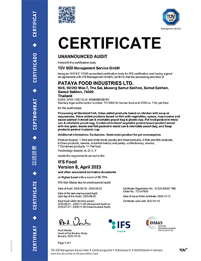 With commitment and improvement throughout 40 years of its operations, PFG - Pataya Food Group has been acknowledged on its international standard from accredited institutes both locally and internationally such as GMP , HACCP , BRC , IFS , ISO 22000 , ISO 9001 , Orthodox Union, MSC and Halal as an assurance on PFG - Pataya Food Group’s commitment to quality